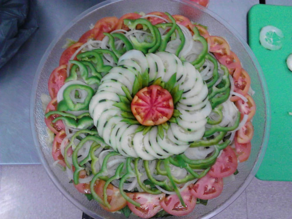 A mix of iceberg & romaine lettuce, tomatoes, cucumbers, onions & peppers.